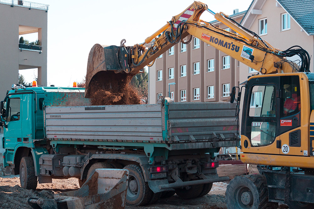 Ein kompletter eigener Fuhrpark vom Kleinbagger bis zum 40-Tonner garantiert schnelle Arbeitsabläufe und effiziente Arbeitsweisen.